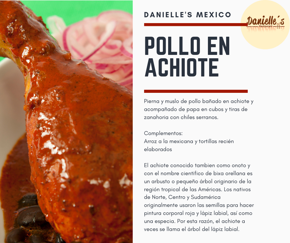 Pierna y muslo de pollo bañado en achiote y acompañado de papa en cubos y tiras de zanahoria con chiles serranos.